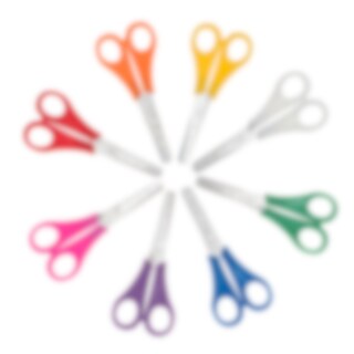 Innehåller: 32 saxar i 8 färger och ett förvaringsställ av trä.