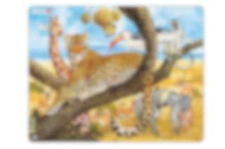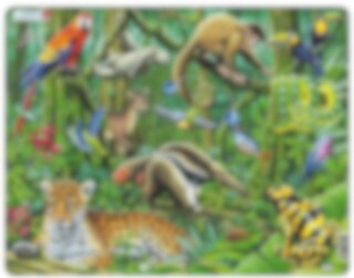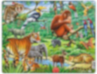 Fyra pussel som lär elever att känna igen vilda djur i Afrika, Sydamerika och Asien, bland annat giraff, kolibri och orangutang.