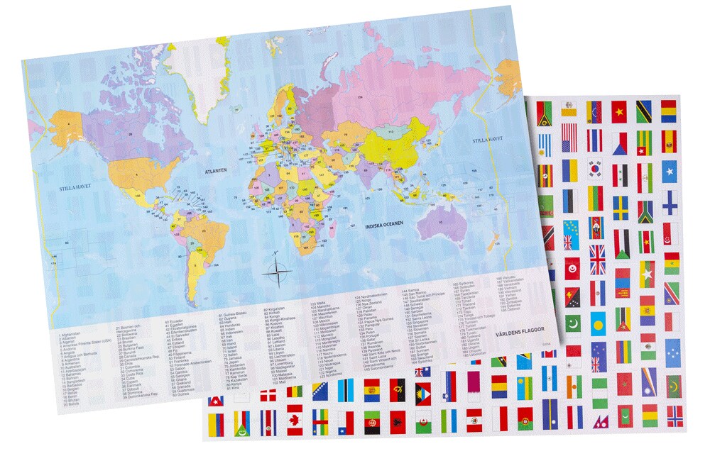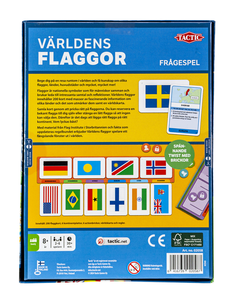 Innehåller: 200 flaggkort, 6 kontintentplattor, 6 actionbrickor, 1 världskarta, spelregler