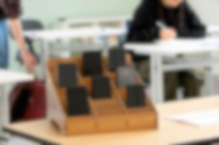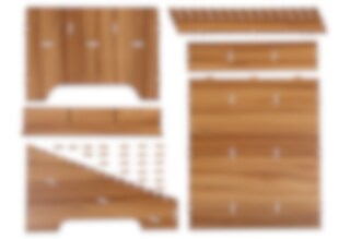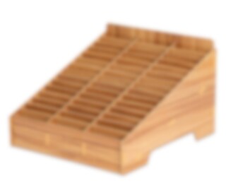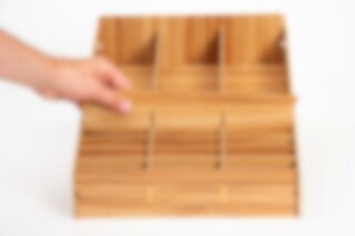 Materialet är 3 mm tjock MDF med träutseende. Mobilhotellet har måtten 31 cm (längd) x 34,5 cm (bredd) x 22 cm (höjd i bakkant). De individuella facken har måtten 10 cm (längd) x 2 cm (bredd) x 6 cm (höjd). (Vill ni ha större fack går det att plocka bort en eller flera av de avskiljande väggarna).