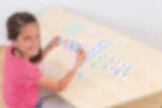 Innehåller: Ental 1-9 (gröna siffror), tiotal 10-90 (blå siffror), hundratal 100-900 (röda siffror) samt tusental 1000-9000 (gröna siffror). Talkorten är förpackade i en träask med lock.