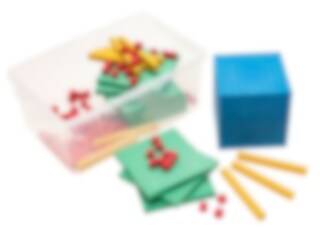 Entalet är en kub med sidlängden 1 cm, tiotalet är 10 cm långt, osv. Dessa mått gör att materialet också är användbart till olika mätövningar.