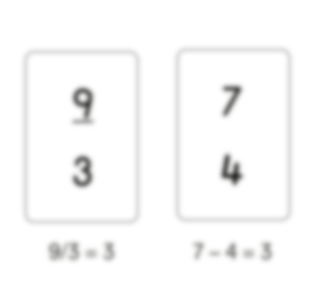 • Spelare 1 har ett kort med talen 7 och 4 på hand. Det här kortet går att matcha med det första kortet eftersom 7 - 4 = 3, dvs en av de möjliga kombinationerna. Spelare 1 lägger ut sitt kort och säger samtidigt "nio dividerat med tre är tre, och sju minus fyra är tre".