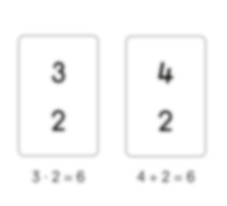• Vänd upp det översta kortet i högen. Det här kortet ska spelare 1 försöka matcha med något av sina egna kort. Exempel: Det uppvända kortet har talen 9 och 3. Med hjälp av de fyra räknesätten går dessa att kombinera till 12 (9 + 3), 6 (9 - 3), 27 (9 x 3) eller 3 (9/3).