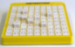 Uppgiften finns att läsa på knappens ovansida. Tryck till. Svaret finns på framsidan av knappen, som nu har ploppat upp och stannar där. Är svaret rätt - låt knappen vara uppe. Är svaret fel - tryck ner knappen och pröva igen. När alla knappar är uppe är alla uppgifterna rätt besvarade. En Knäpp upp till varje räknesätt.