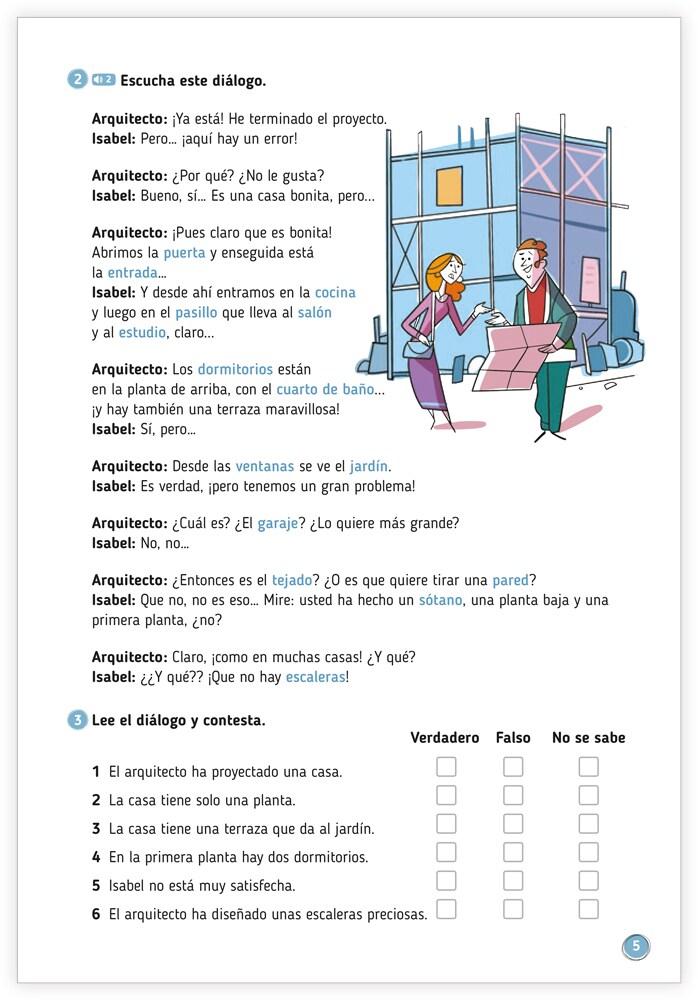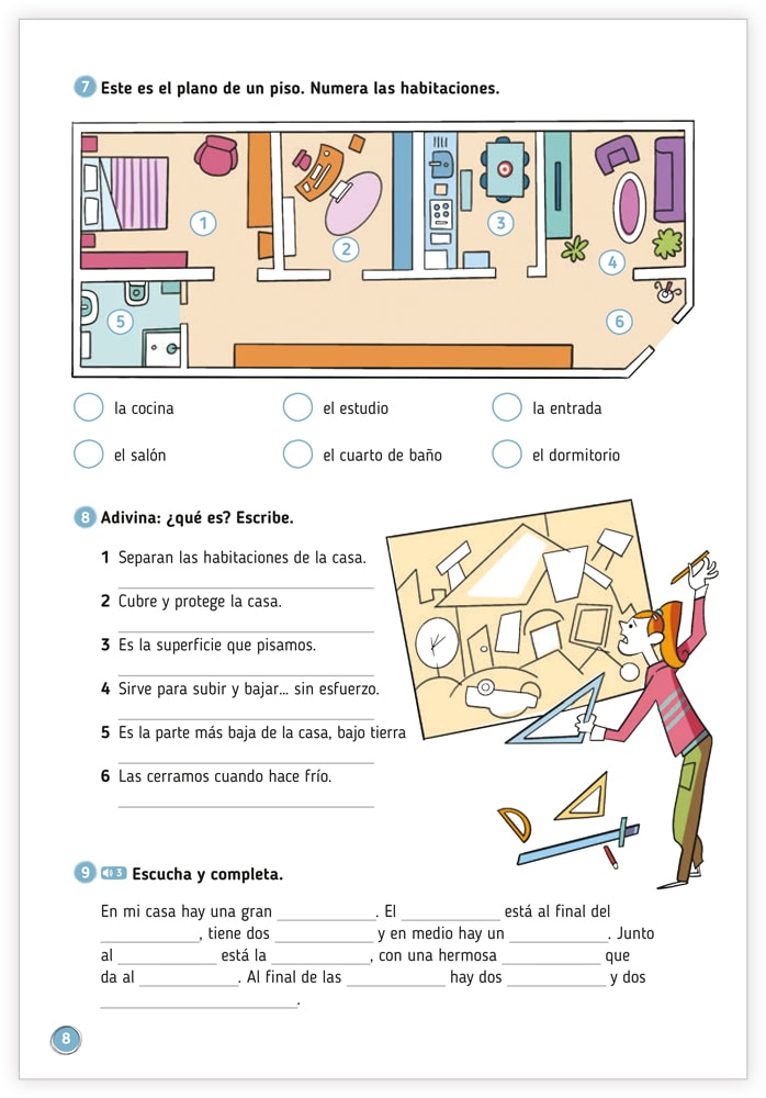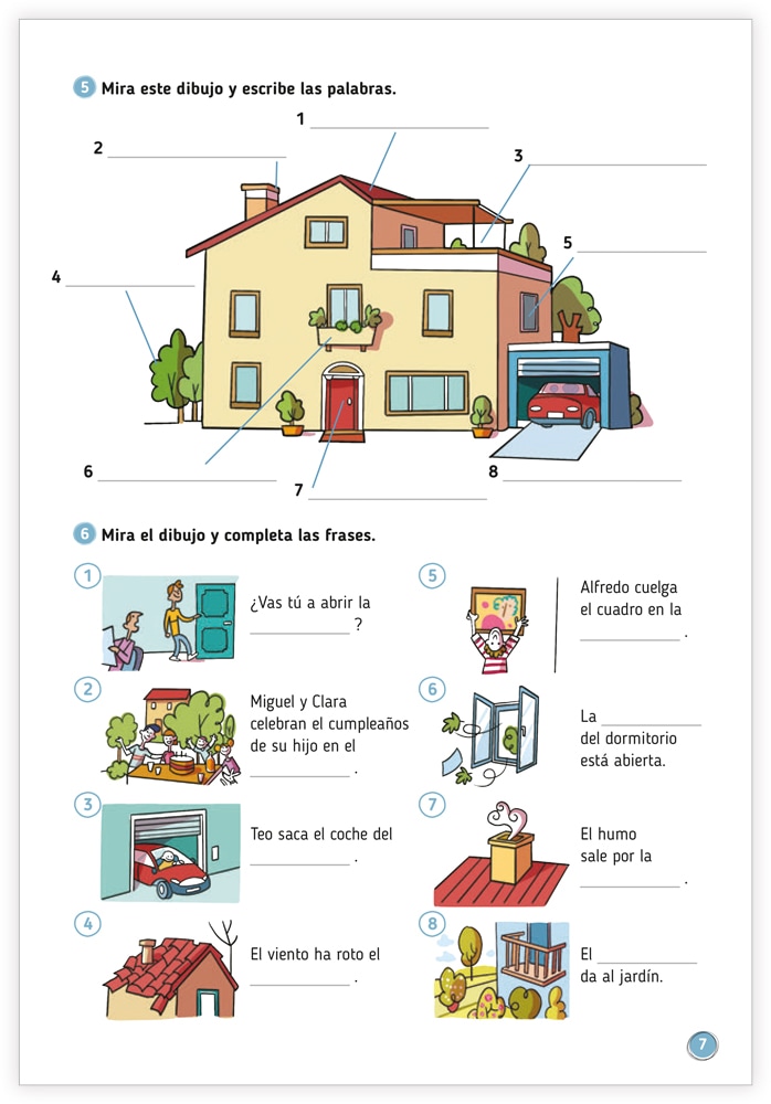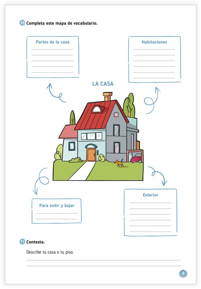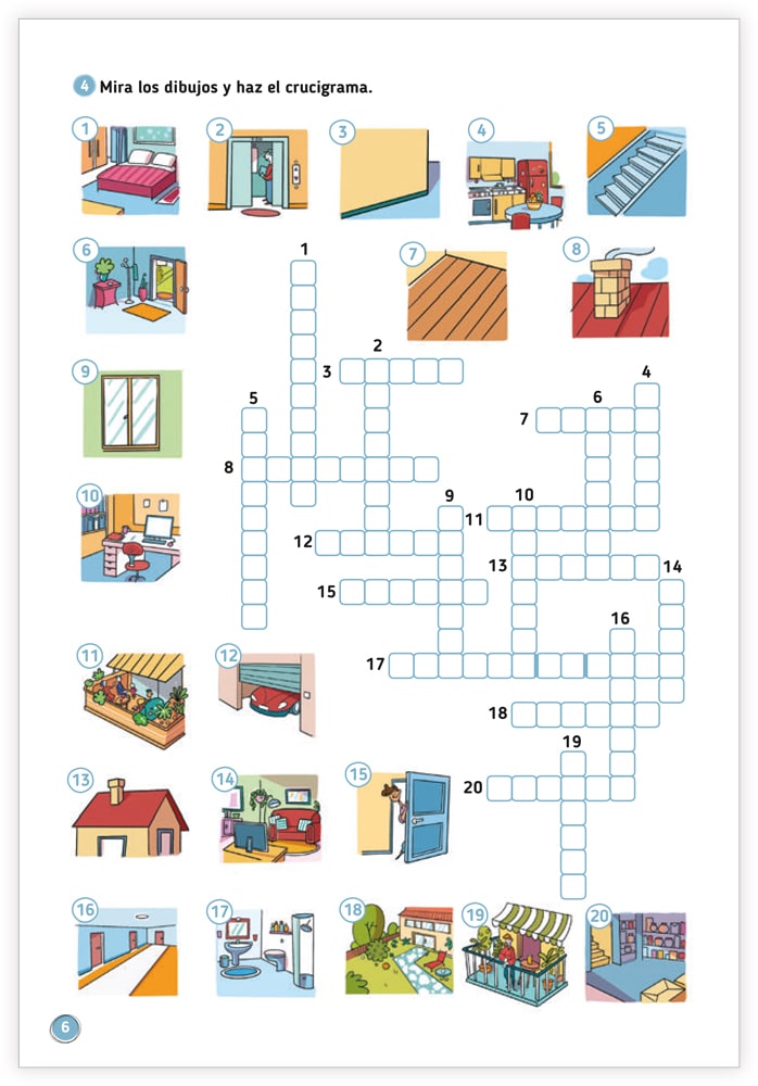 Fristående övningsbok i spanska. Den innehåller 14 kapitel som vart och ett tar upp ett tema med illustrerade ord. Dessa används sedan i olika spel och aktiviteter som t.ex. korsord, finn rätt ord, ordlekar. Olika övningar i fransk grammatik förekommer också. Facit i slutet av häftet.