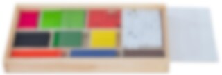 Innehåller: 308 cuisenairestavar (176 vita, 36 röda, 36 ljusgröna, 12 rosa, 10 gula, 10 mörkgröna, 10 svarta, 6 bruna, 6 blå och 6 orange. Trälåda med plexiglaslock och fack för de olika typerna av stavar. Lådans storlek är 33 x 18 x 3 cm.